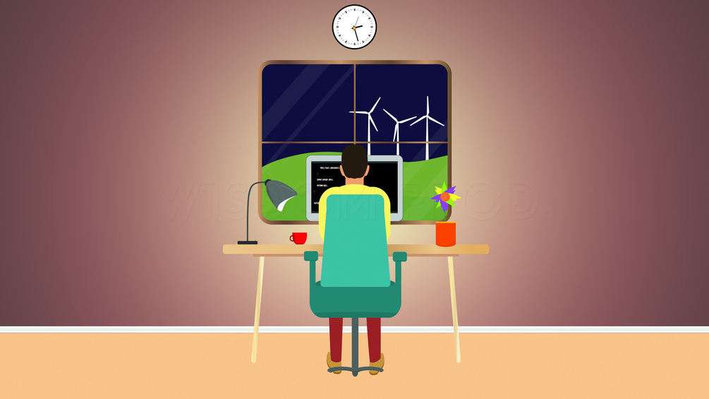 Experience the convenience of working from home with this stunning vector animation of a man sitting in front of a monitor screen, coding and working on web development as time passes from day to night. Watch as the view from the window changes from a blue sky to a dark night, complete with green grass and rotating wind turbines in the background. From the back view, you can see a dedicated male programmer hacking away at his computer as hours pass by on the wall clock. Perfect for anyone in the tech industry or looking to showcase the benefits of remote work.