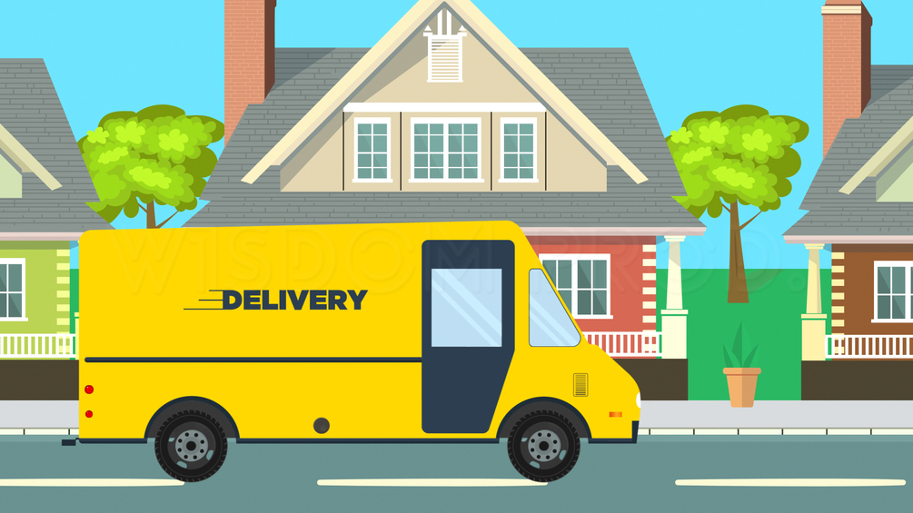 A colorful 2D cartoon-style animation depicting a delivery truck arriving at a house and dropping off a large package at the front door. Set in a detailed residential street scene, this animation is perfect for illustrating package delivery services, e-commerce shipping, online shopping, or last-mile logistics concepts. The clean vector style makes it easy to integrate into explainer videos, advertisements, websites, or digital marketing projects. After Effects and Adobe Illustrator templates are included in raw format (compatible with 2019 and above), with no tutorials provided.